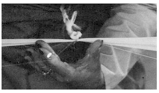 tandis que le majeur rompt par en dessous les deux fils auniveau du noeud de la cordelette.