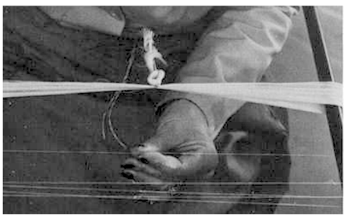 A l'aide d'une cordelette, elle réunit les deux paquets de fils ensemble.